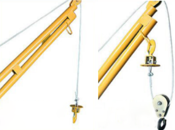 小吊机具有不错的载重能力,它的额定负载可以根据钢丝绳连接方式的不同而发生大幅度的改变,接下来我们就来了解一下小吊机钢丝绳不同的连接方式。小吊机臂杆的顶端下方大多配有一条固定的吊环,这个吊环的作用就是将小吊机单独定滑轮的吊运方式改变为定动滑轮组,我们都知道,定滑轮只能改变力的方向而不能改变里的大小,而滑轮组既可以改变力的方向,又可以改变力的大小,从而变相的为小吊机增加了一倍的载重量。小吊机的这种设计方式充分的利用了力学原理,使用者可以根据不同的吊运重量来选择不同的吊运方式。
